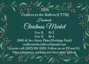 Nov 8 Crafters to the Rafters Christmas Handmade Market Handmade market All Handmade!!! Our 2 day event runs from Nov 8th 10am-5pm to Nov 9th 10am-4pm. We have 100+ vendors, free admission, free parking and amazing door prizes. There's something for everyone and we appreciate your... Read more