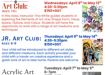 In this class, instructor Tina White guides students in exploring the Elements of Art: Line, Shape, Form, Value, Space, Texture, and Colour. Students will have the opportunity to work with a range of art mediums and...